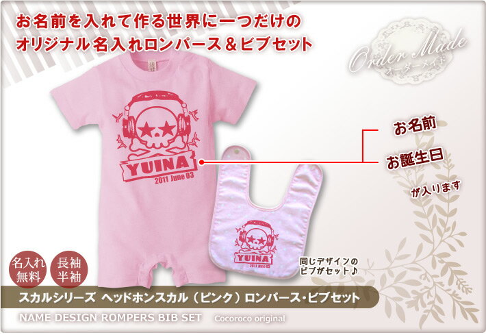 出産祝いに【名入れ無料】名前入り・半袖・長袖のロンパース&今治ビブ(スタイ/よだれかけ)セット・ドクロ がいこつ スカル デザイン ヘッドホンスカル(ピンク) 男の子 女の子 百日祝い 【メール便対応】 【ココロコ】